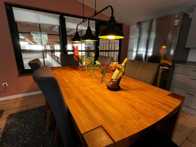 Die moderne Wohnküche ist mit allem ausgestattet, was man zum Verpflegen braucht: Elektroherd, Backofen, Spülmaschine, Side by Side Kühlschrank, Kaffeemaschine, Wasserkocher, Toaster und natürlich Geschirr, Besteck und Kochutensilien. Vom Esstisch können Sie direkt in die Reithalle blicken.