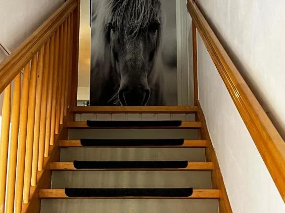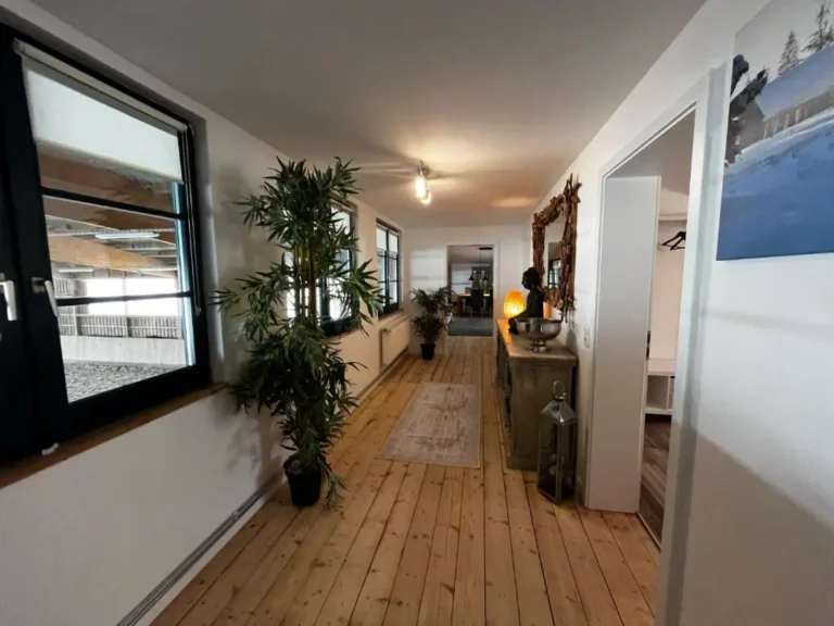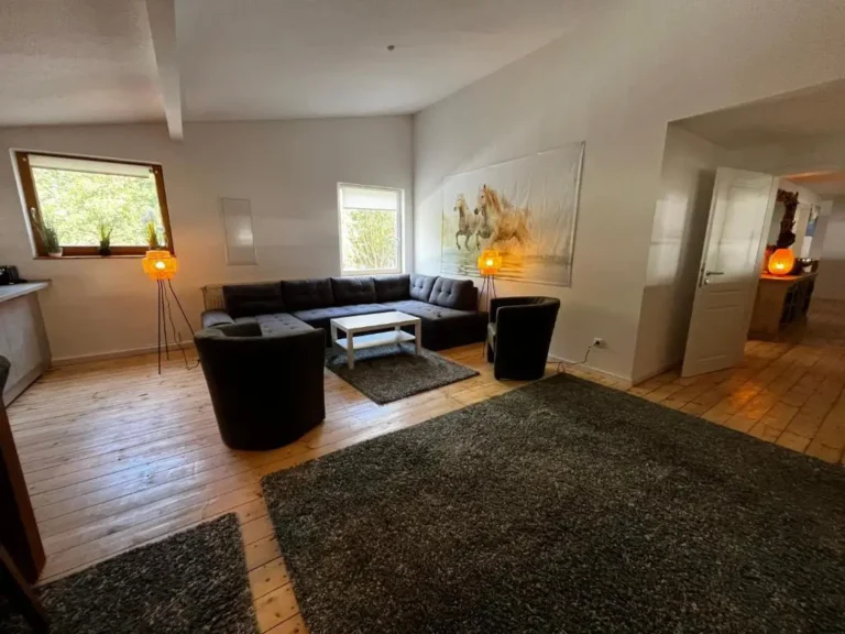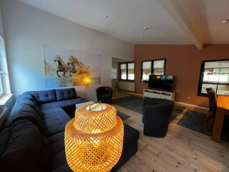 Die Ferienwohnung „Meerlust“ ist im oberen Stockwerk der Reithalle über eine Treppe erreichbar und bietet auf 130 m2 Platz für 4 – max. 6 Personen (gegen Aufpreis) und zwei Hunden (gegen Gebühr). Nach einem langen Tag im Sattel können Sie es sich vor dem 55 Zoll Flachbildfernseher auf der Wohnlandschaft mit Schlaffunktion bequem machen oder sich im Massagesessel entspannen.