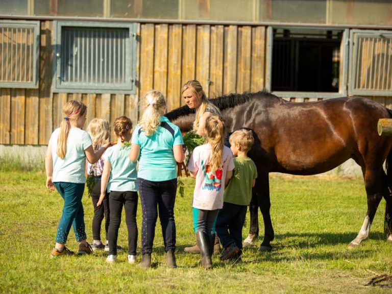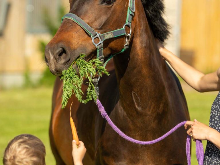 Nach dem Voltigieren versorgen wir das Pferd, putzen es ausgiebig und füttern es mit Möhren, Äpfeln oder ein paar Leckerlies. Dabei lernst du Spannendes über die Fütterung der Pferde. Nachdem die Ponys wieder auf ihren Wiesen grasen, steht auch für uns eine Stärkung an. Es gibt eine kleine Vesper mit Obst und Gemüse sowie Getränken. Den Tag lassen wir mit einem Spiel ausklingen, dass die Gruppe gemeinsam auswählt. Sehr beliebt sind „Pferd spielen“ oder eine kleine Schnitzeljagd.